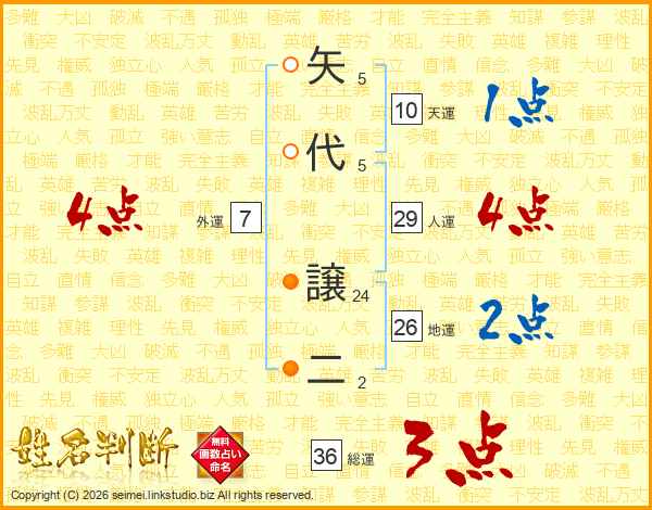 家系が持つ宿命的な運勢を表します。祖先から受け継いだ苗字ですので自分の力が及びません。家柄を象徴します。苗字の合計画数。