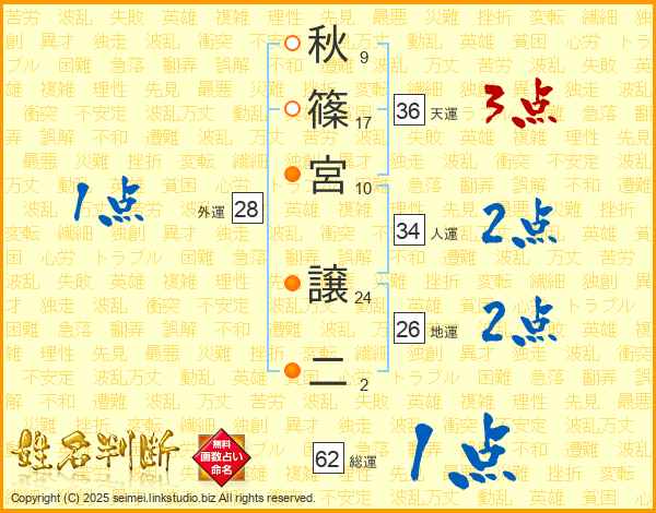 秋篠宮譲二さんの総運は62画の1点!