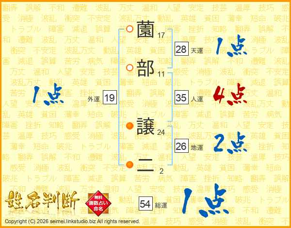 画数の奇数(○陽)と偶数(●陰)の配列で吉凶を占います。どちらかにかたよる名前は大凶名で避ける必要があります。画数の奇数偶数。