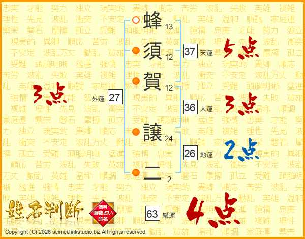 蜂(13画)須(12画)賀(12画) 譲(24画)二(2画)