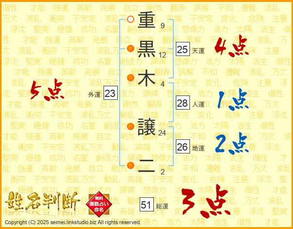重(9画)黒(12画)木(4画) 譲(24画)二(2画)