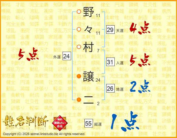 野(11画)々(11画)村(7画) 譲(24画)二(2画)