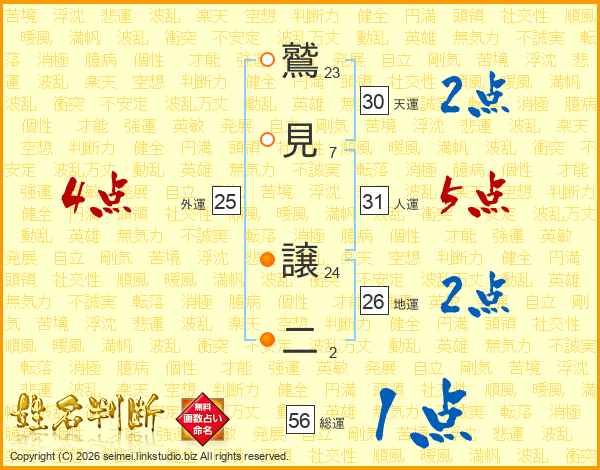 鷲(23画)見(7画) 譲(24画)二(2画)