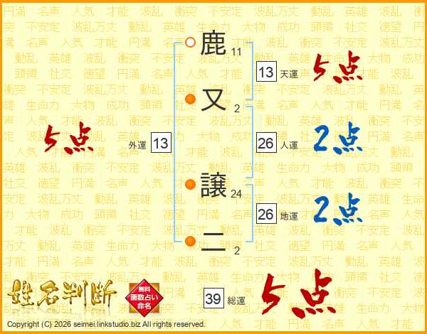 鹿又譲二さんの総運は39画の5点!
