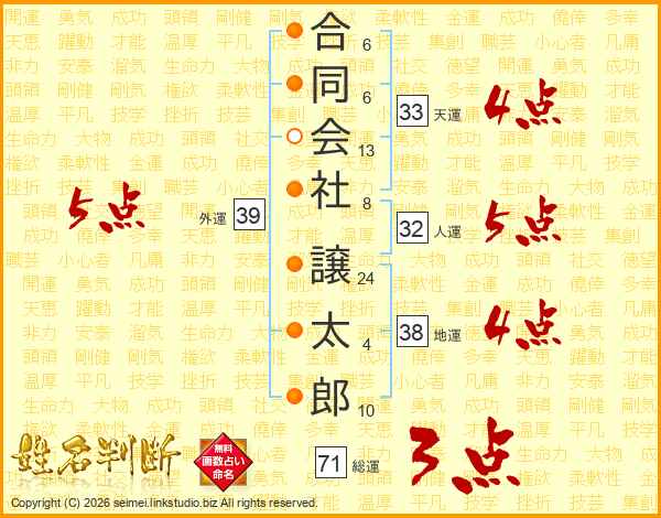 合(6画)同(6画)会(13画)社(8画) 譲(24画)太(4画)郎(10画)