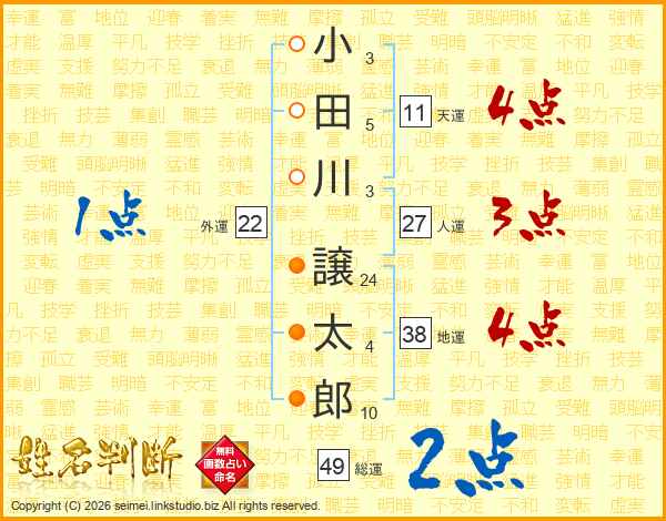 小(3画)田(5画)川(3画) 譲(24画)太(4画)郎(10画)
