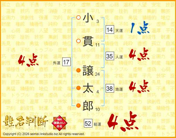 小(3画)貫(11画) 譲(24画)太(4画)郎(10画)