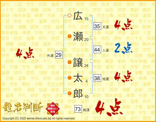 広(15画)瀬(20画) 譲(24画)太(4画)郎(10画)