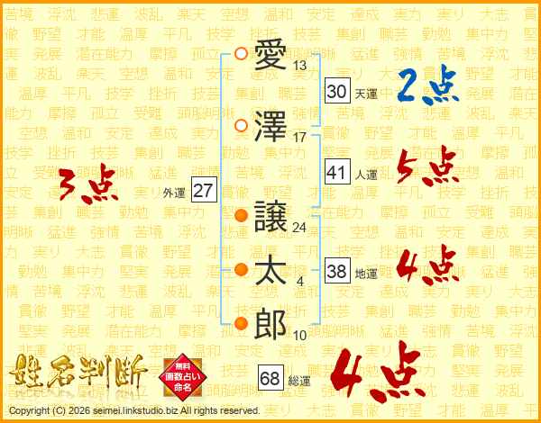 愛澤譲太郎さんの総運は68画の4点!