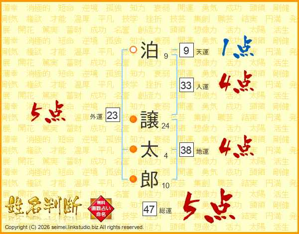 泊(9画) 譲(24画)太(4画)郎(10画)