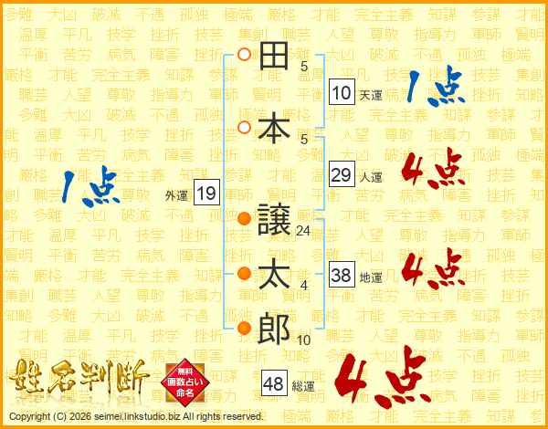 田(5画)本(5画) 譲(24画)太(4画)郎(10画)