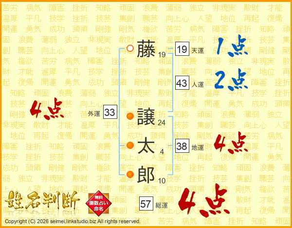 藤(19画) 譲(24画)太(4画)郎(10画)