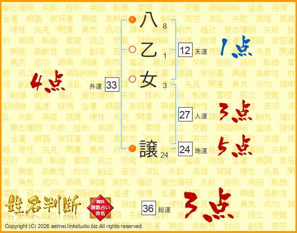 生活面を象徴する運勢です。外部から受ける影響力を表し、結婚運、家庭運や職場、環境への順応性を表します。総運から人運を引いた画数。姓や名が1文字の場合を除く。