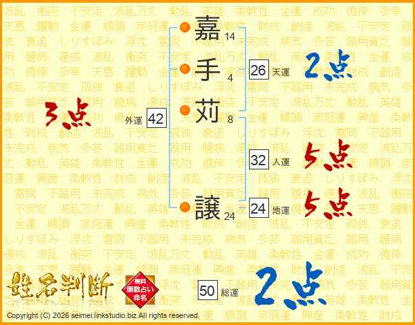 嘉(14画)手(4画)苅(8画) 譲(24画)