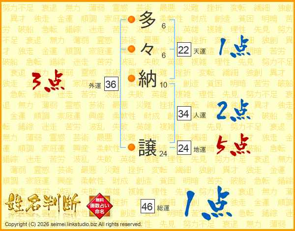 生活面を象徴する運勢です。外部から受ける影響力を表し、結婚運、家庭運や職場、環境への順応性を表します。総運から人運を引いた画数。姓や名が1文字の場合を除く。