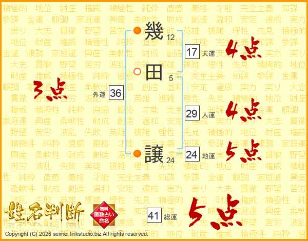 生活面を象徴する運勢です。外部から受ける影響力を表し、結婚運、家庭運や職場、環境への順応性を表します。総運から人運を引いた画数。姓や名が1文字の場合を除く。
