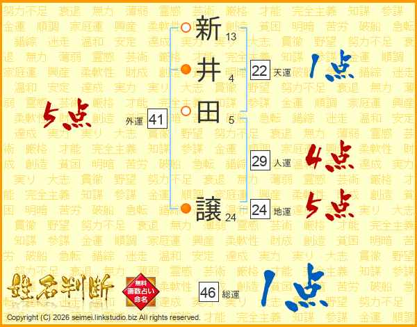 生活面を象徴する運勢です。外部から受ける影響力を表し、結婚運、家庭運や職場、環境への順応性を表します。総運から人運を引いた画数。姓や名が1文字の場合を除く。