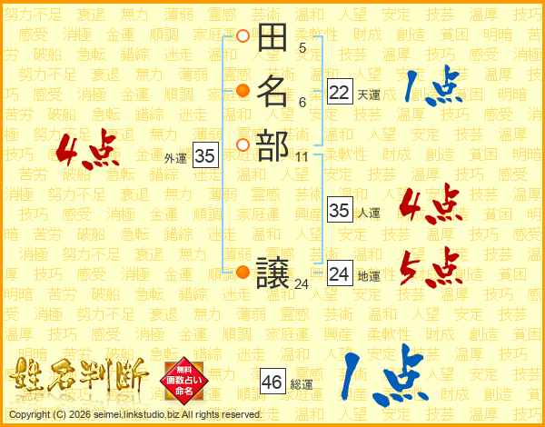 生活面を象徴する運勢です。外部から受ける影響力を表し、結婚運、家庭運や職場、環境への順応性を表します。総運から人運を引いた画数。姓や名が1文字の場合を除く。