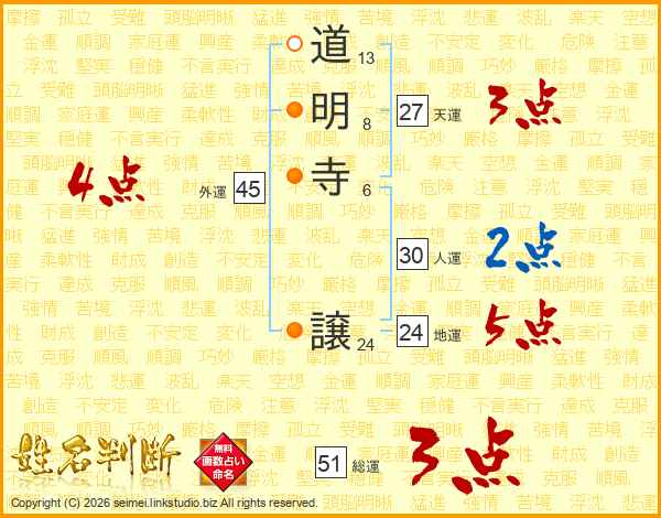 生活面を象徴する運勢です。外部から受ける影響力を表し、結婚運、家庭運や職場、環境への順応性を表します。総運から人運を引いた画数。姓や名が1文字の場合を除く。