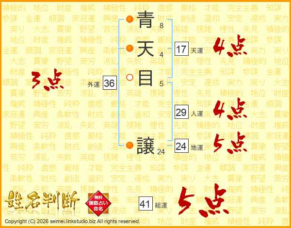 生活面を象徴する運勢です。外部から受ける影響力を表し、結婚運、家庭運や職場、環境への順応性を表します。総運から人運を引いた画数。姓や名が1文字の場合を除く。