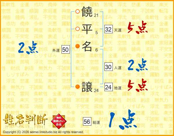 生活面を象徴する運勢です。外部から受ける影響力を表し、結婚運、家庭運や職場、環境への順応性を表します。総運から人運を引いた画数。姓や名が1文字の場合を除く。