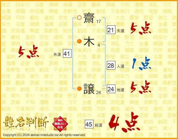生活面を象徴する運勢です。外部から受ける影響力を表し、結婚運、家庭運や職場、環境への順応性を表します。総運から人運を引いた画数。姓や名が1文字の場合を除く。