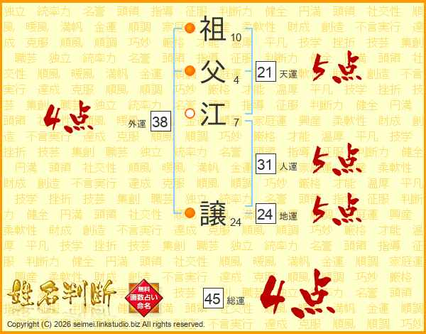 生活面を象徴する運勢です。外部から受ける影響力を表し、結婚運、家庭運や職場、環境への順応性を表します。総運から人運を引いた画数。姓や名が1文字の場合を除く。