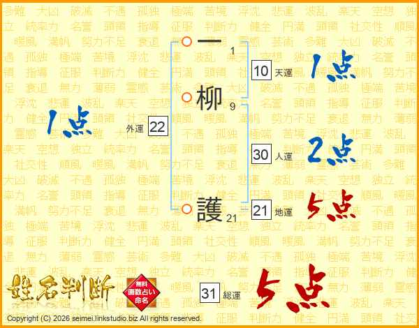 生活面を象徴する運勢です。外部から受ける影響力を表し、結婚運、家庭運や職場、環境への順応性を表します。総運から人運を引いた画数。姓や名が1文字の場合を除く。