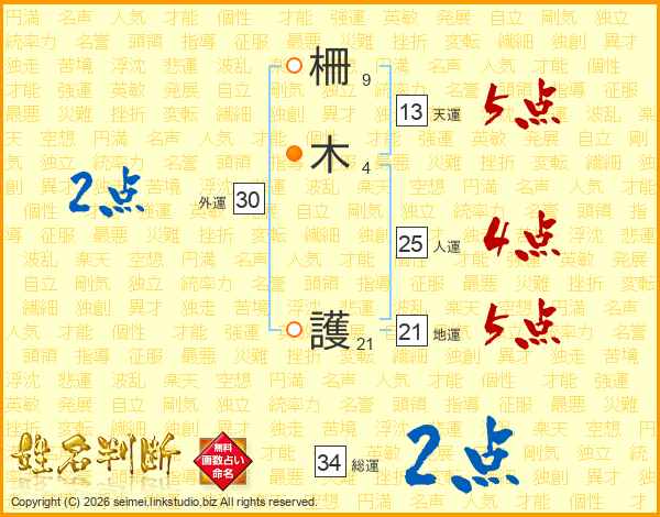 生活面を象徴する運勢です。外部から受ける影響力を表し、結婚運、家庭運や職場、環境への順応性を表します。総運から人運を引いた画数。姓や名が1文字の場合を除く。