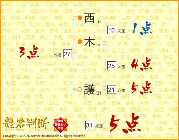 生活面を象徴する運勢です。外部から受ける影響力を表し、結婚運、家庭運や職場、環境への順応性を表します。総運から人運を引いた画数。姓や名が1文字の場合を除く。