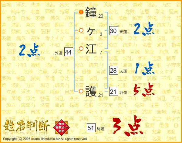 鐘(20画)ヶ(3画)江(7画) 護(21画)