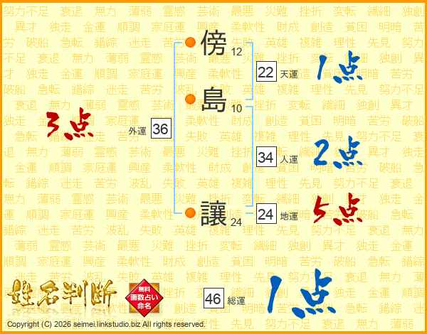 生活面を象徴する運勢です。外部から受ける影響力を表し、結婚運、家庭運や職場、環境への順応性を表します。総運から人運を引いた画数。姓や名が1文字の場合を除く。
