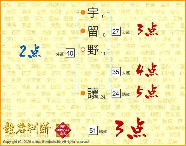 宇留野讓さんの総運は51画の3点!