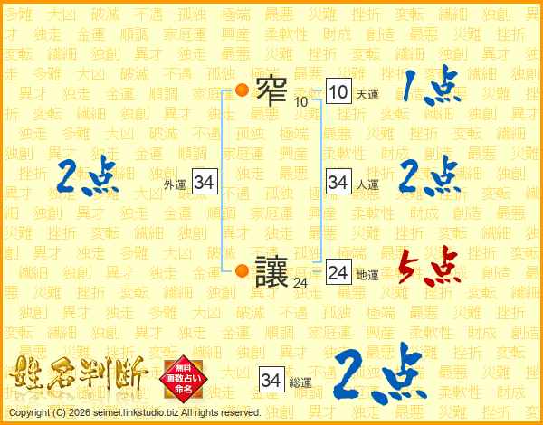 生活面を象徴する運勢です。外部から受ける影響力を表し、結婚運、家庭運や職場、環境への順応性を表します。総運から人運を引いた画数。姓や名が1文字の場合を除く。