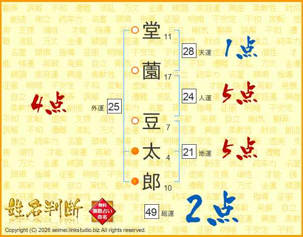 堂(11画)薗(17画) 豆(7画)太(4画)郎(10画)
