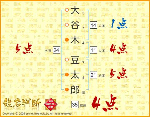 大(3画)谷(7画)木(4画) 豆(7画)太(4画)郎(10画)