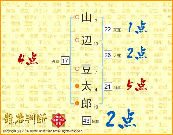 山(3画)辺(19画) 豆(7画)太(4画)郎(10画)