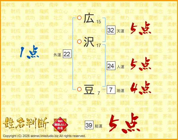 広沢豆さんの総運は39画の5点!