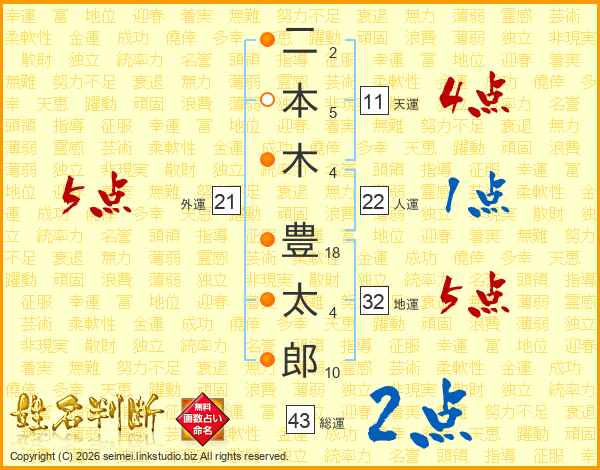 二(2画)本(5画)木(4画) 豊(18画)太(4画)郎(10画)