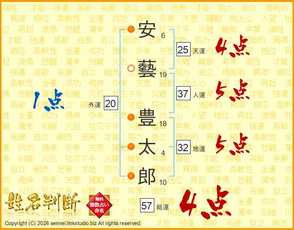 安(6画)藝(19画) 豊(18画)太(4画)郎(10画)