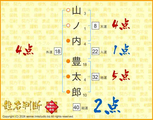 山(3画)ノ(1画)内(4画) 豊(18画)太(4画)郎(10画)