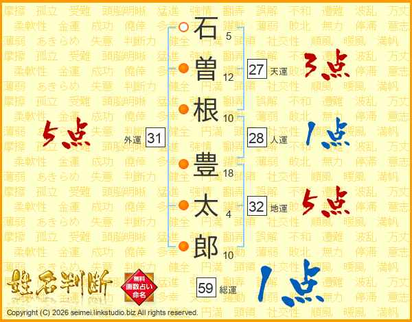 石(5画)曽(12画)根(10画) 豊(18画)太(4画)郎(10画)