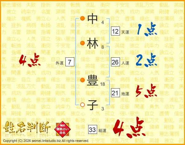 中(4画)林(8画) 豊(18画)子(3画)
