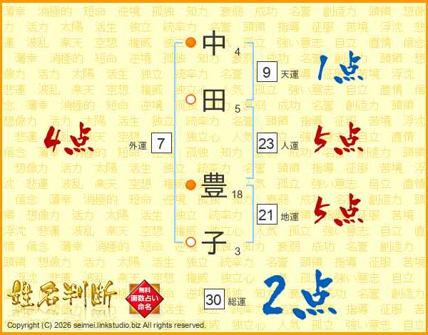 中(4画)田(5画) 豊(18画)子(3画)