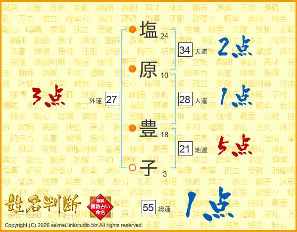 塩(24画)原(10画) 豊(18画)子(3画)