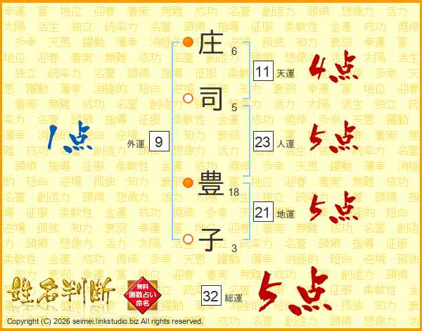 庄(6画)司(5画) 豊(18画)子(3画)