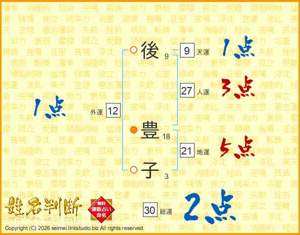後(9画) 豊(18画)子(3画)