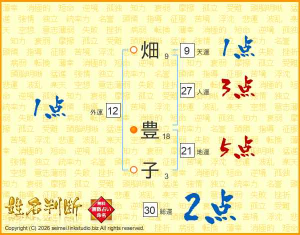 生活面を象徴する運勢です。外部から受ける影響力を表し、結婚運、家庭運や職場、環境への順応性を表します。総運から人運を引いた画数。姓や名が1文字の場合を除く。