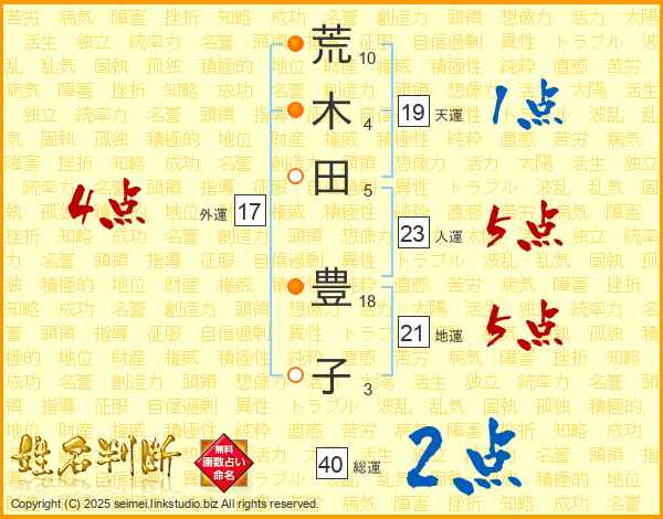荒(10画)木(4画)田(5画) 豊(18画)子(3画)