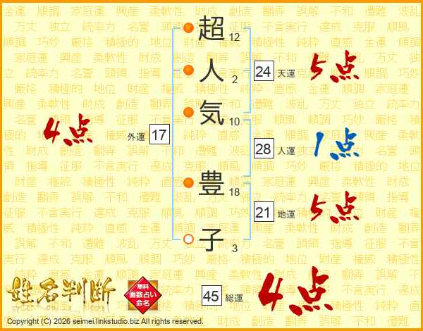 超(12画)人(2画)気(10画) 豊(18画)子(3画)
